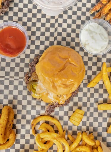 Beef patty, cheese, raw onion, tomato sauce & mustard on Sourdough Roll.